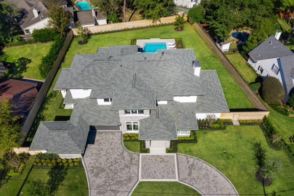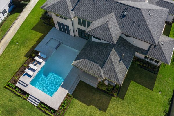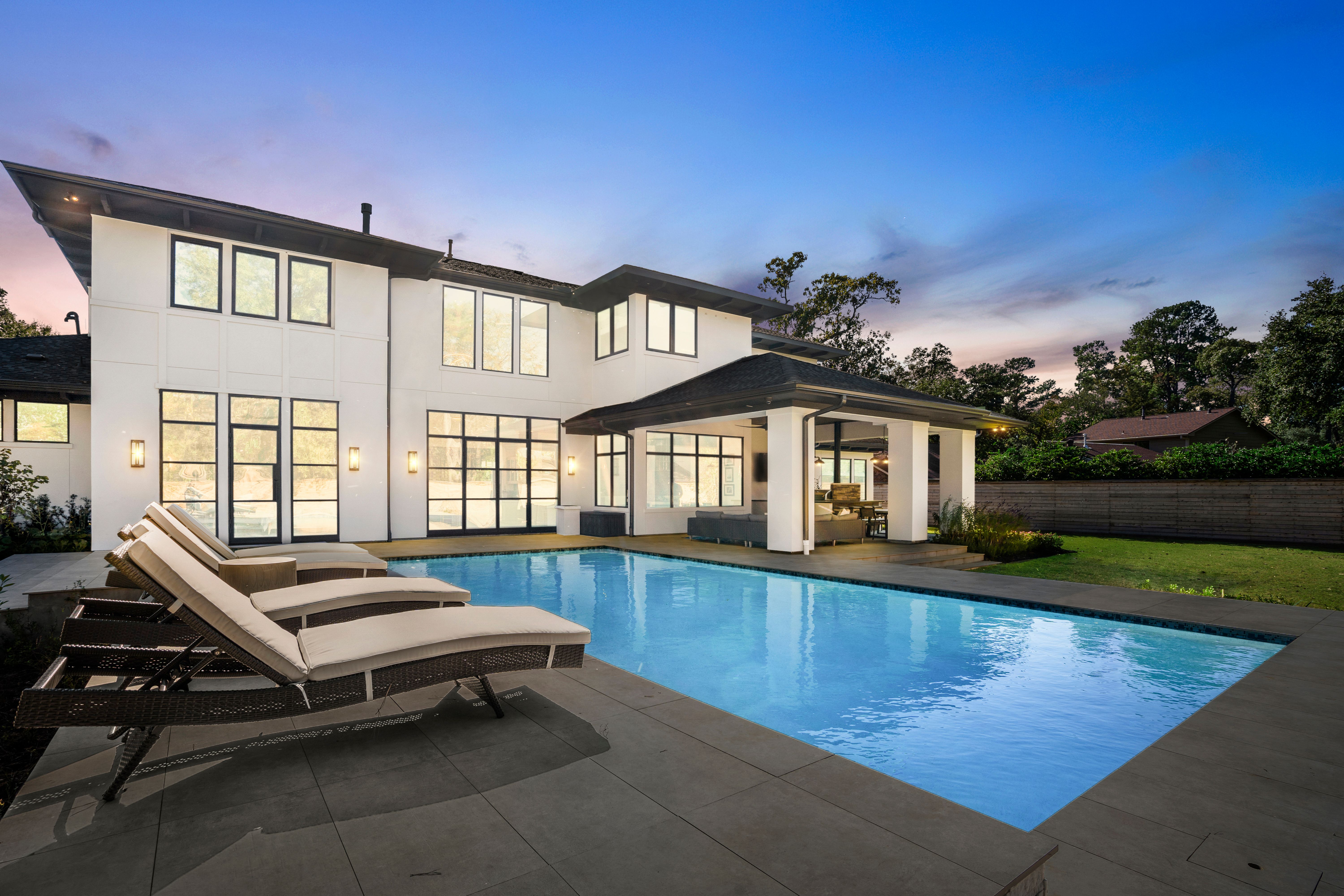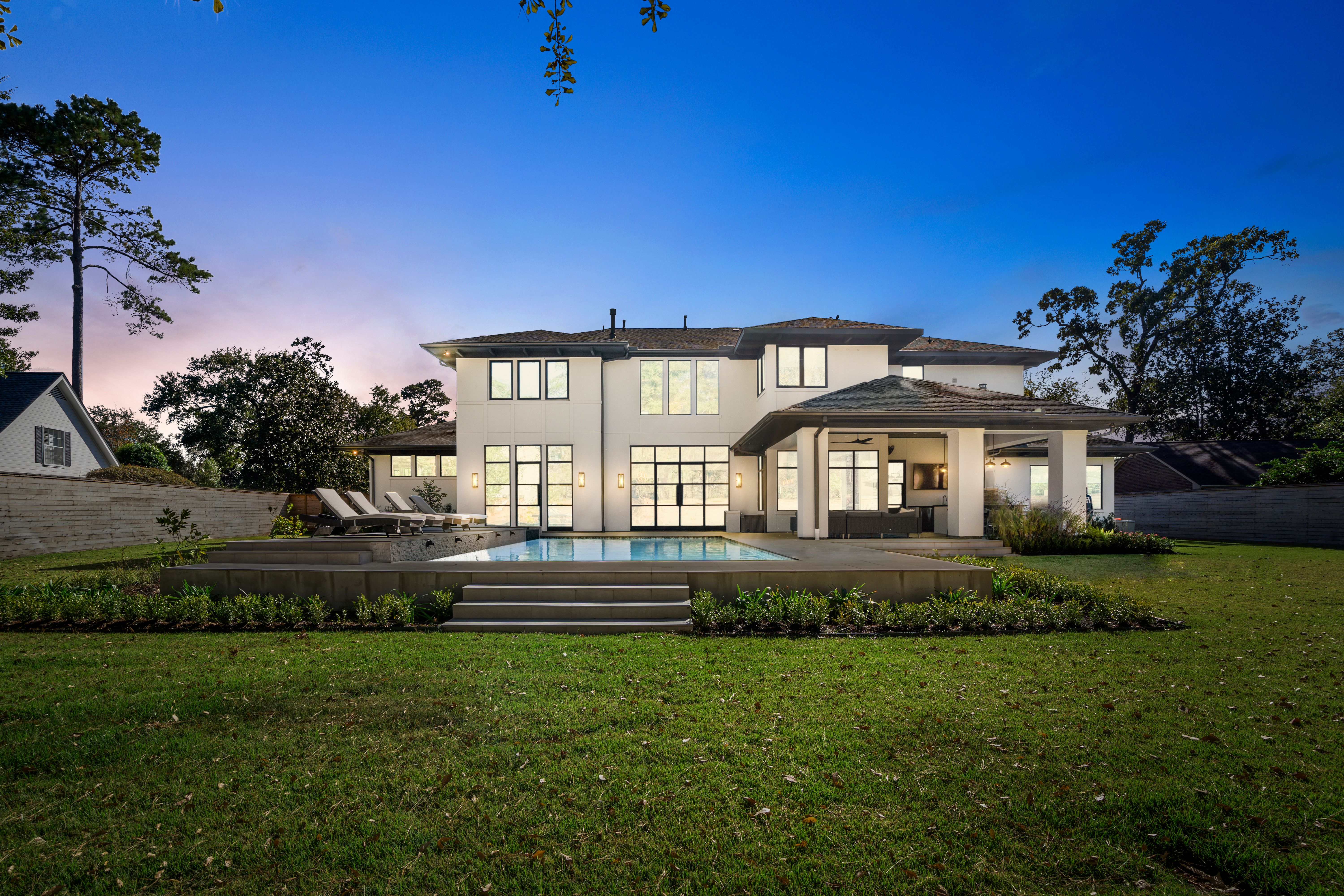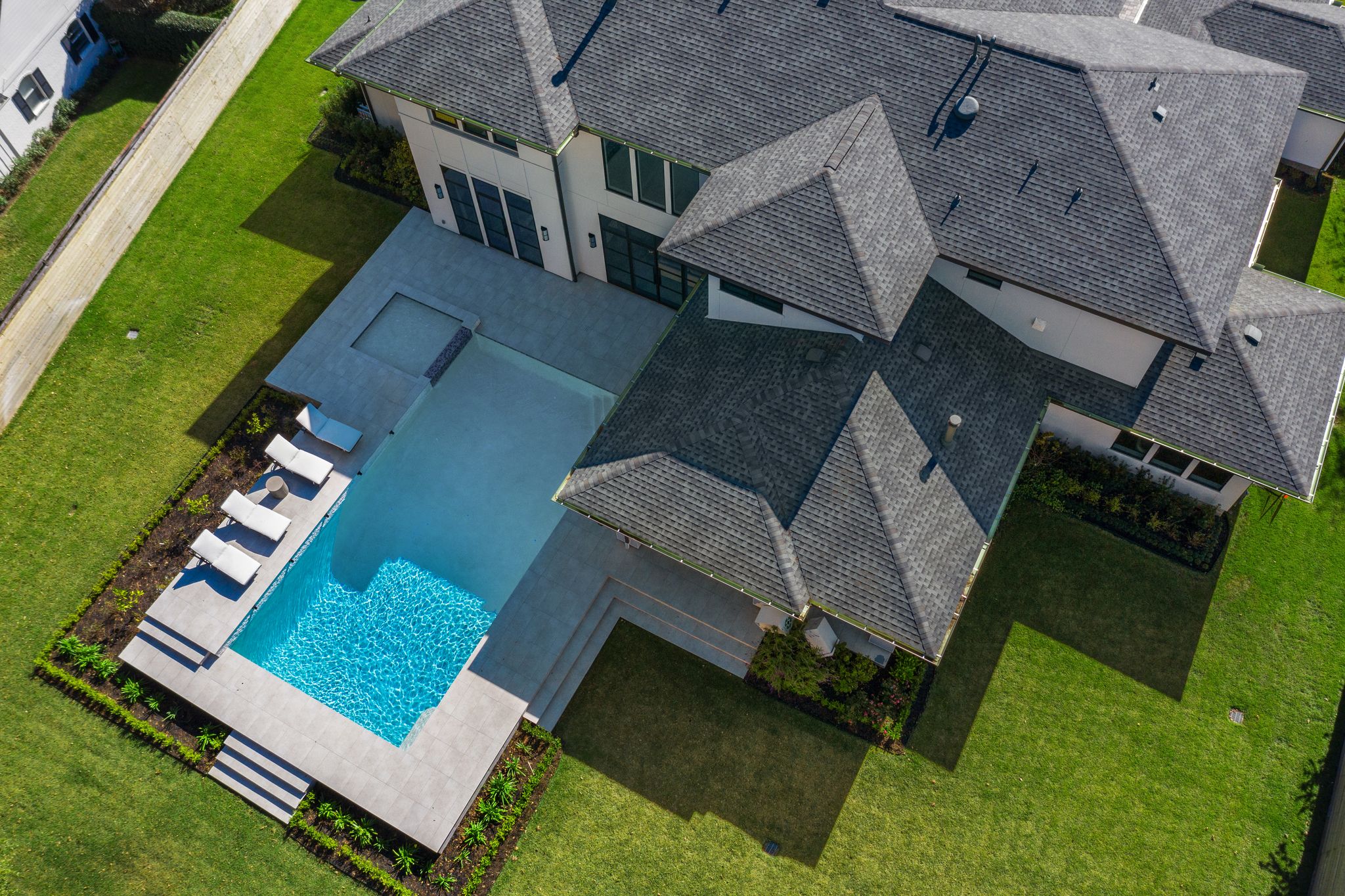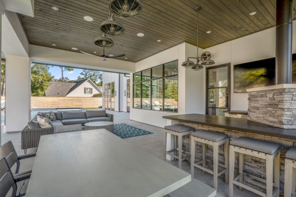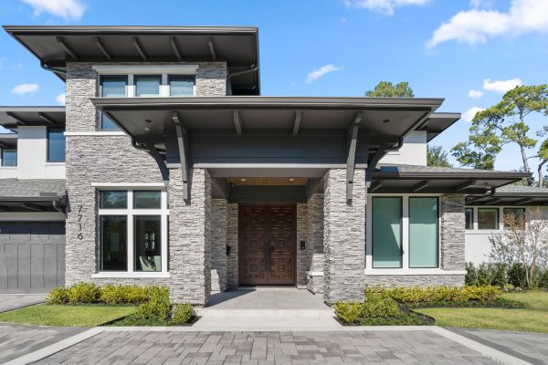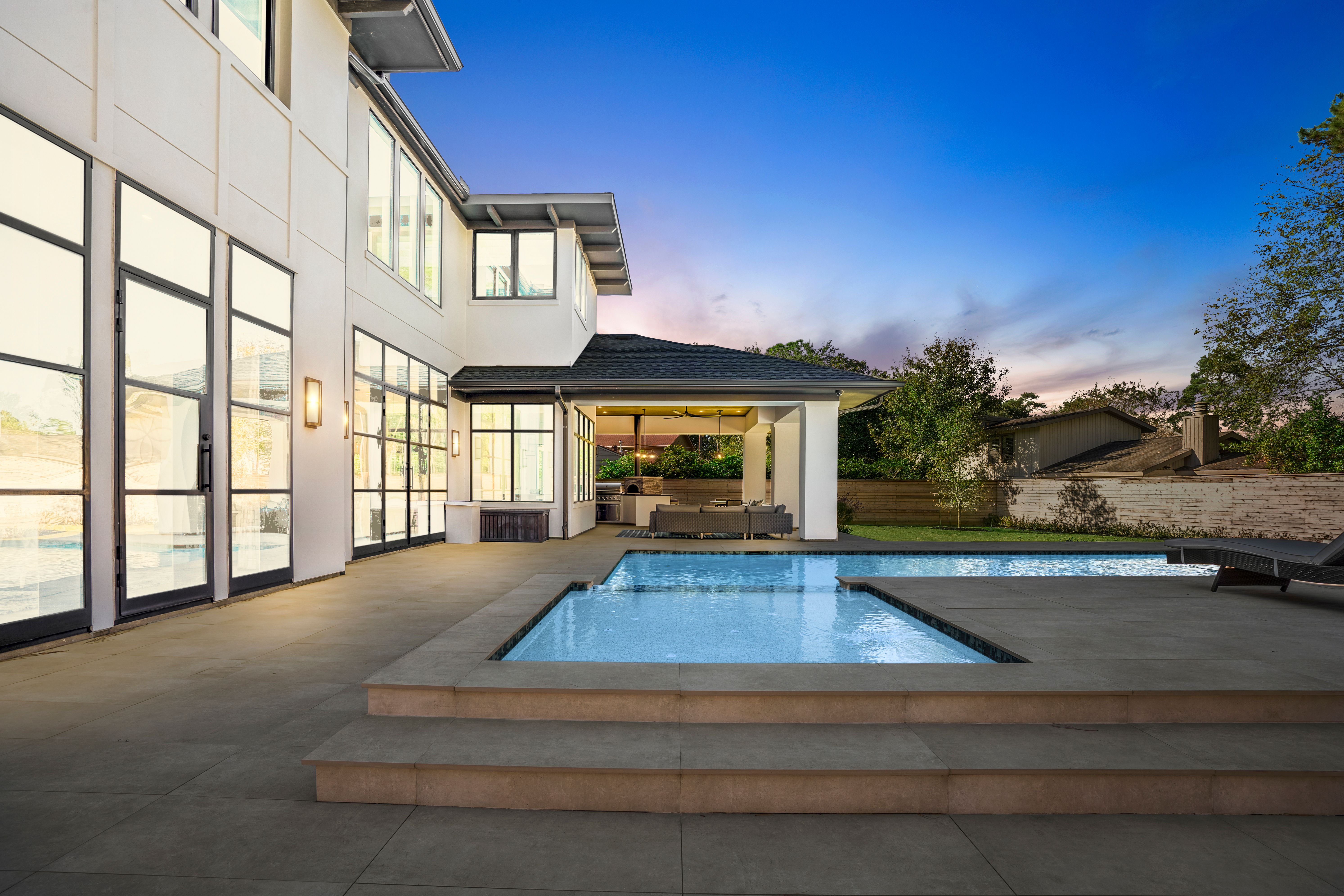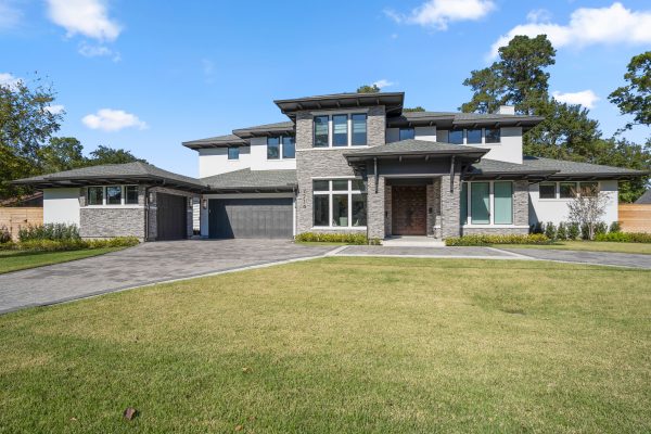 Broad overhangs, painted wood corbels, stone and stucco, and a custom wood double entry door greet you as you approach this contemporary, large lot home. The centerpiece of the large, open concept living spaces is the showcase wine room and bar. An elegant open staircase encircles the baby grand piano, providing views of the two-story foyer and living room. In the kitchen, a bold black and brass custom hood vent stands in contrast to the sophisticated, waterfall-edge white marble island. The owner’s suite on the first floor features a bath that is a luxury spa retreat, complete with a large open shower, a modern freestanding tub, and textured tile walls.