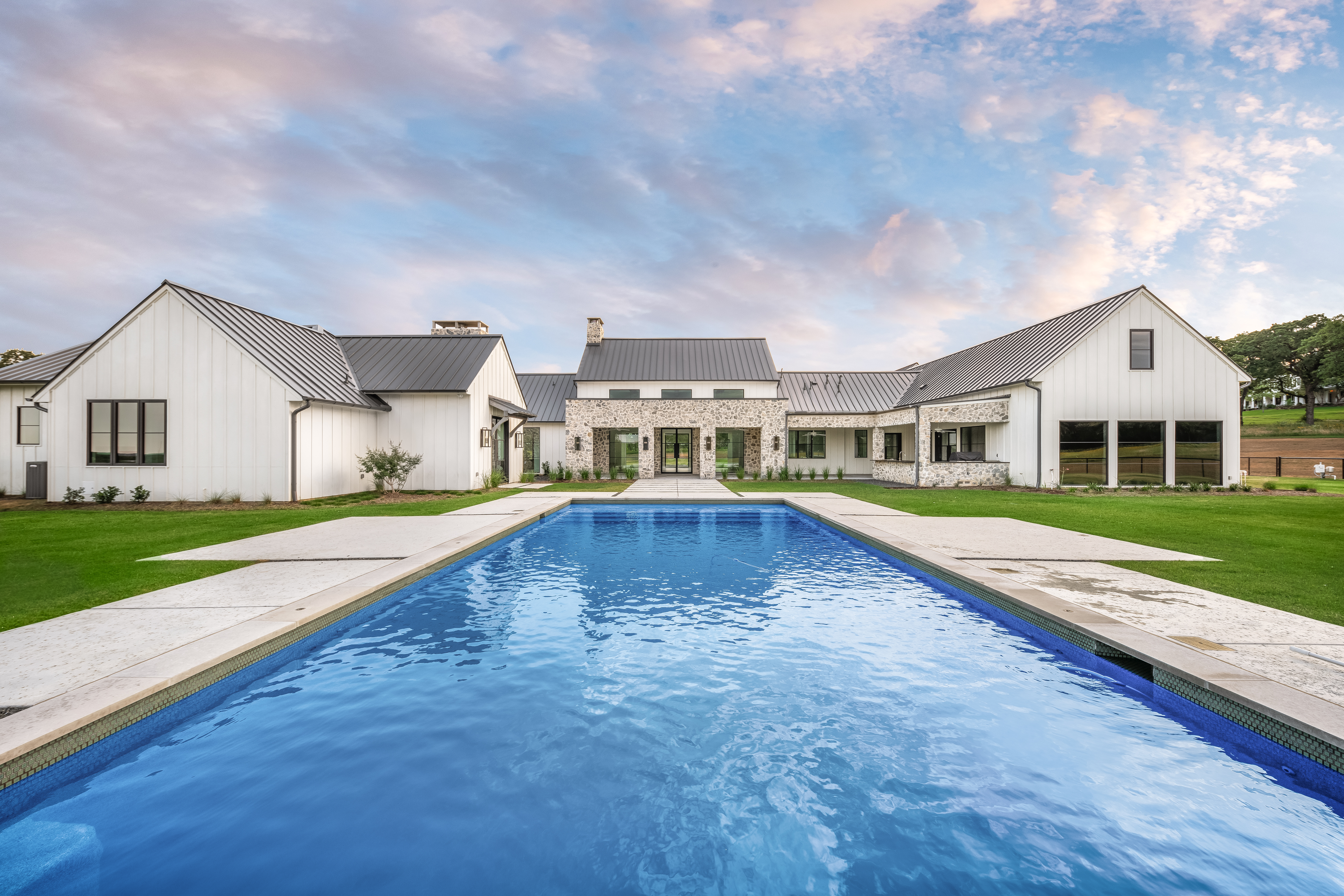 We love the Texas Hill Country! This large acreage property allowed for a more sprawling design than we typically achieve on our infill neighborhood projects. The exterior features native Texas stone, board-and-batten siding, and a standing-seam metal roof. The owner is an interior designer, and she maintained a beautiful, simple sophistication throughout. The home is designed in a wing configuration – a central open-concept living wing flanked by the bedroom wing on one side and utility and game room areas on the other.